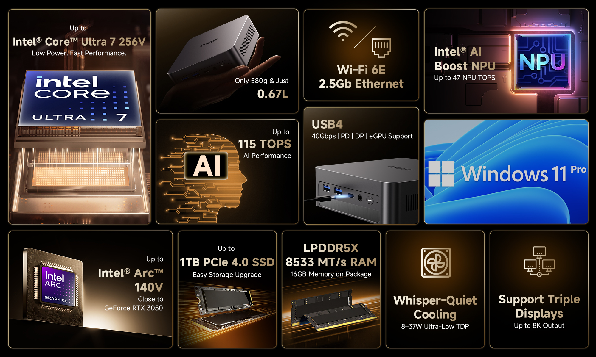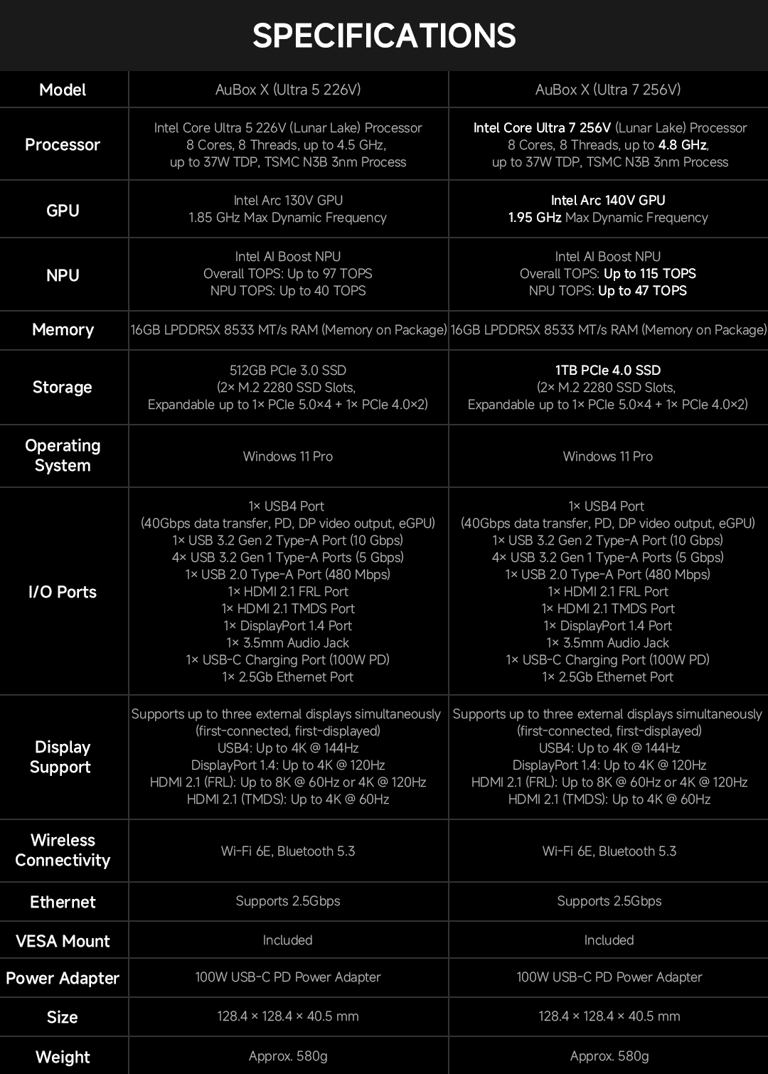 The AuBox X is available in two configurations featuring Intel Core Ultra 5 226V or Intel Core Ultra 7 256V processors, both built on Intel’s advanced Lunar Lake architecture. With 8 cores and 8 threads, boost speeds up to 4.8GHz, and a configurable 8–37W TDP, the mini PC delivers responsive performance for productivity, creative workloads, and everyday computing while maintaining extremely low noise levels.